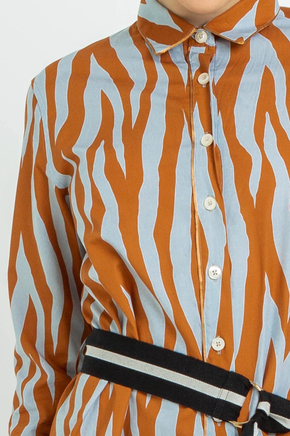 Patterned chemisier dress with removable belt in contrasting colour. Detailing on profiles, classic collar, front button fastening and back logo print. Regular fit