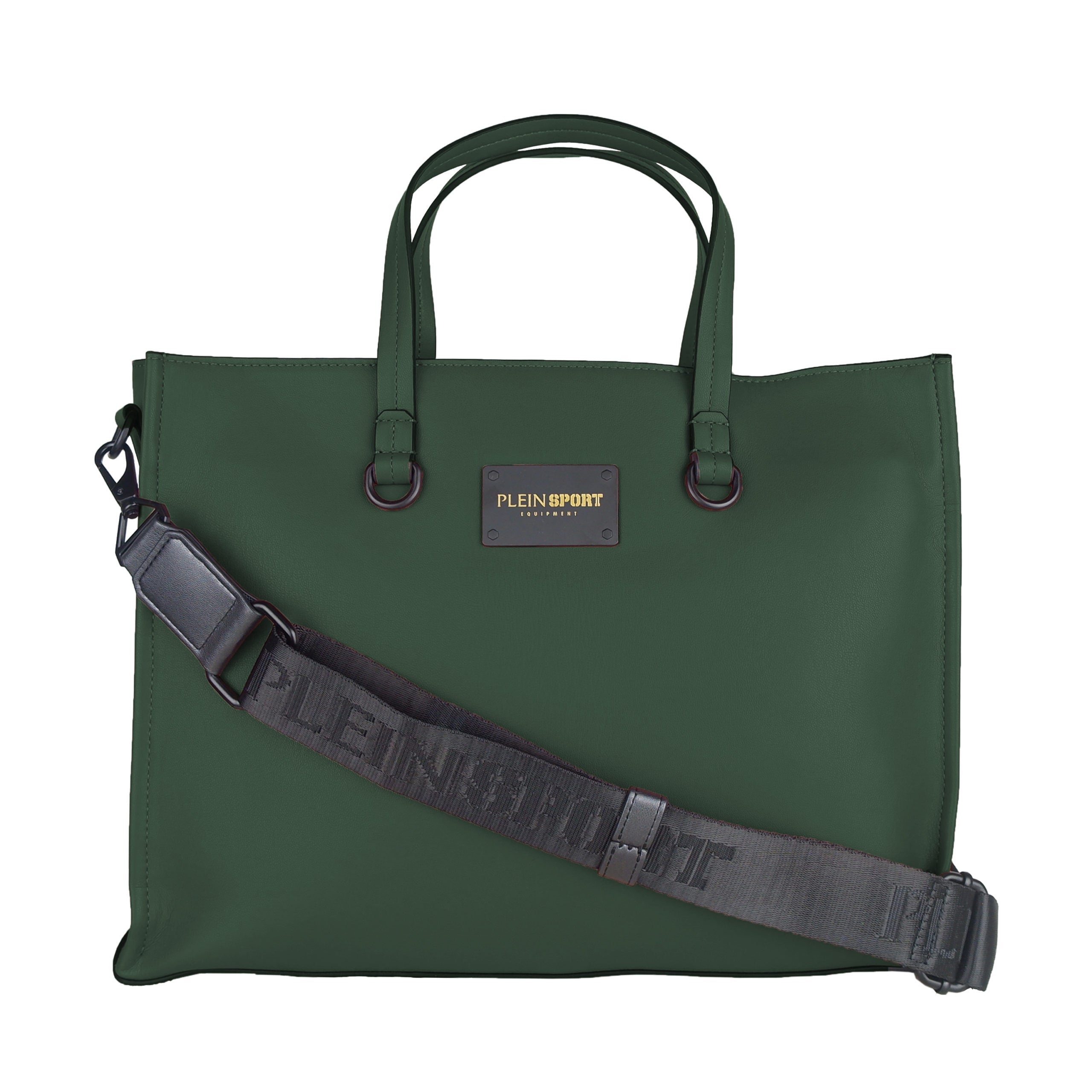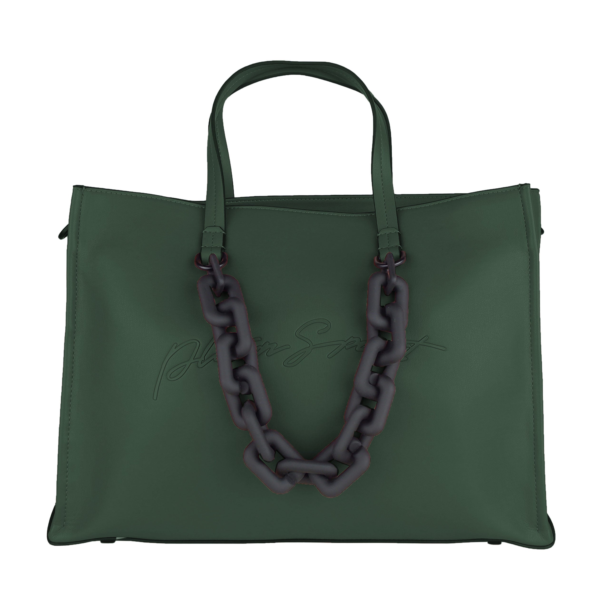 Plein Sport shopping bag in eco-leather, dark green with embossed logo print, zip closure and internal pockets, ornamental chain in opaque plastic.